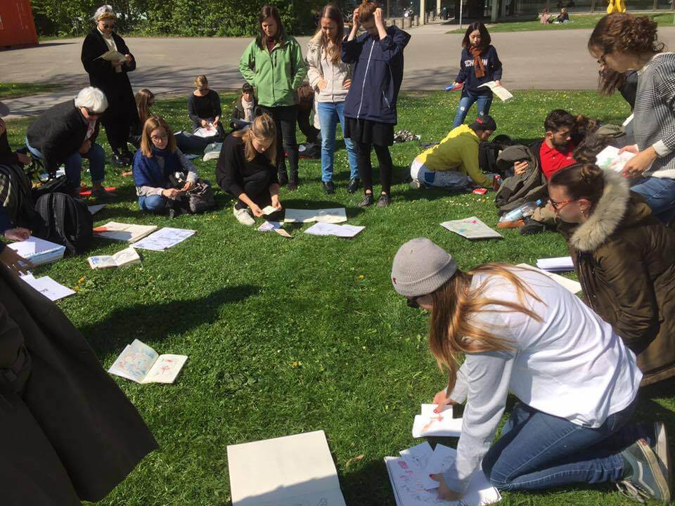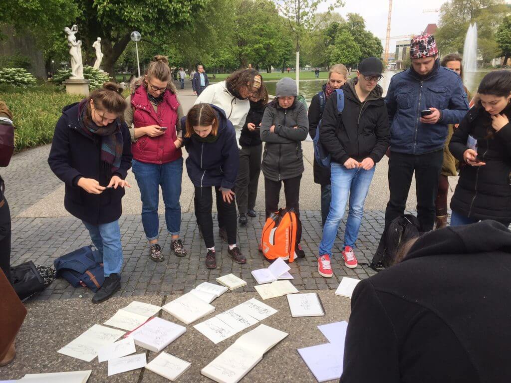 Wir orientieren wir uns teils am Manifest des Urban Sketching, gehen jedoch bewusst darüber hinaus. Wir erweitern die klassische Skizze durch den Einsatz verschiedenster Medien – analog und digital, von Zeichnung, Malerei, Collage und Tape Art bis hin zu Fotografie, Performance und konzeptuellen Ansätzen. Gearbeitet wird an ausgewählten, inspirierenden Orten. Durch ortsbezogene Aufgabenstellungen verlassen die Teilnehmenden immer wieder ihre gestalterische Komfortzone und entdecken neue Möglichkeiten. Der Schwerpunkt liegt auf den Prozessen, nicht auf fertigen Ergebnissen. Im Zentrum stehen gegenseitige Unterstützung, gemeinsames Lernen und das Reflektieren der Arbeiten. Skizzen werden dokumentiert, gesammelt und teilweise über Social Media geteilt, um Inspiration nach außen weiterzugeben.